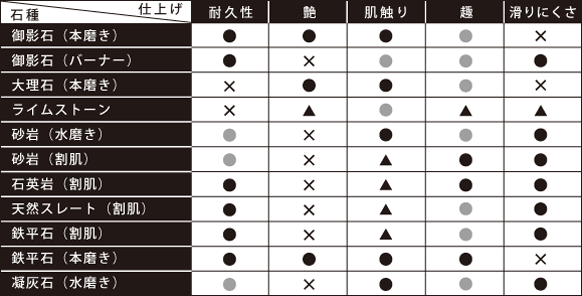こうした観点から石の性質や特性を表にまとめました。