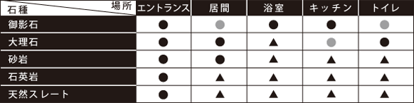 居間は大理石や砂岩系の柔らかみのある石が向いているし、浴室は外壁に条件が似ています。